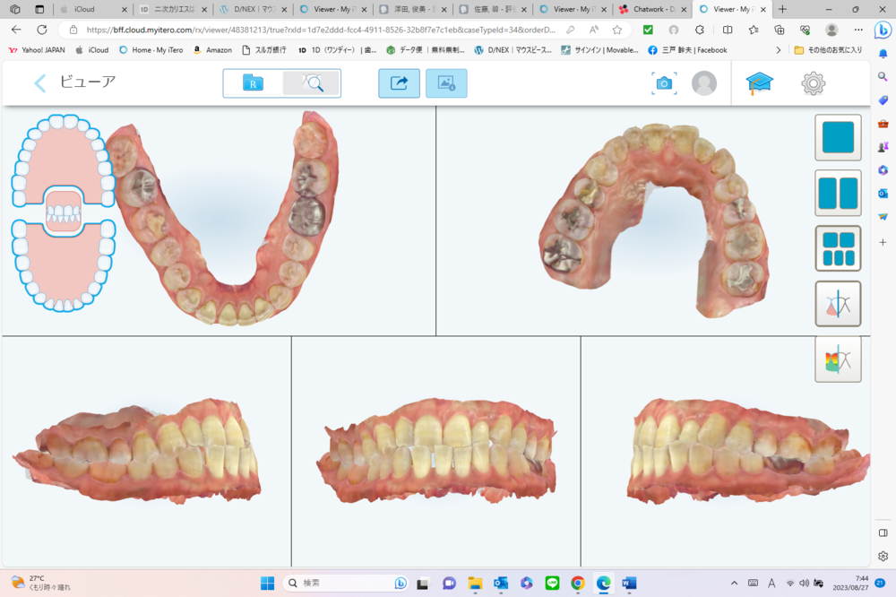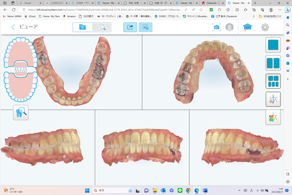 この患者さんは受け口(反対咬合といいます)、叢生と下顎前歯部のすきっ歯です。反対咬合は下顎骨そのものが大きく噛み合わせが反対になっている場合と、歯が原因の場合があります。骨格そのものが大きい場合は、手術で骨を切り咬み合わせを整えなければならないので、当院ではできません。この患者さんの場合は歯に問題があったので治療を進めていきました。治療期間は24ヶ月です。