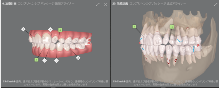 図1はクリンチェックでCT画像が統合されたもの(右)と通常(左)のもの。CTと統合されたものは犬歯が埋伏していてその位置がわかるので動かしたい歯が予定通り動くかどうかの判断になります。また、埋伏している親知らずの位置もよくわかります。