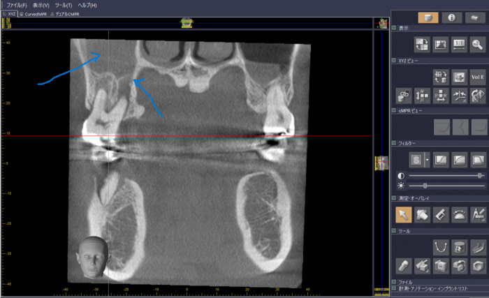 インビザライン治療がきっかけで、CBCTを導入しましたが、抜歯予定の親知らずの位置や神経の管の本数や位置、上顎洞炎いわゆる蓄膿症の診断、原因が歯にある場合のその歯の特定、歯周治療における顎骨の吸収状態がCT画像を駆使することによってわかるようになってきました。具体的に症例をいくつかお見せします。