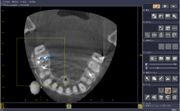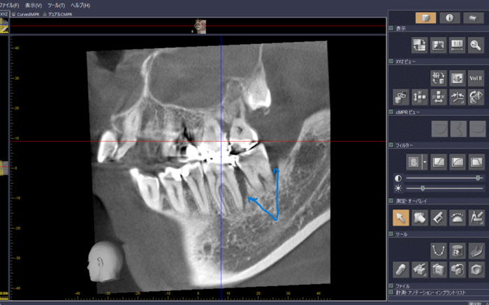 図6では、抜歯する予定の水平に埋伏した親知らずの画像です。三叉神経の一つである下顎神経(矢印下)の走行やいろんな角度から見て歯の形態を確認でます。