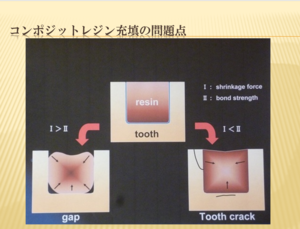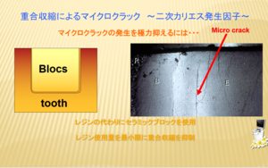 それで、現在主に保険治療で使われているのが、コンポジットレジンという合成樹脂とコンポジットレジンにセラミックが混じったハイブリッドセラミックと言われるものです。保険治療の詰め物で主に使われているのは、コンポジットレジンです。相当昔から前歯の治療には使われていましたが色調に問題があったり、歯の神経(歯髄)に為害作用がありましたが、改良に改良を重ねられて、現在では生体親和性もあり、見た目にも強度の面でも良くなってきて、奥歯の詰め物にも使われるようになってきました。しかしこのコンポジットレジンには大きな欠点があります。重合収縮と言われるものです。コンポジットレジンは柔らかい状態で虫歯を取ってきれいにした状態のところに接着剤を塗布して詰めてゆき、そこにある波長の光を当てて固まらせます。固まる時に重合収縮という現象が起きます。重合収縮は接着剤が弱いと詰めたコンポジットレジンと歯牙との間にわずかな隙間(ギャップ)を作ったり、接着剤が相当に強いと歯の方にわずかなひび(クラック)が入ったりします。(図2、図3)大きい詰め物や隣接面(歯と歯が連なっている面)にかかる詰め物の場合は、詰め物と歯牙の面積と体積が大きくなるので重合収縮が大きくなり、2次カリエスの原因になります。そこで、大きい詰め物や隣接面を含む詰め物は、セラミックを使うのです。セラミックそのものは歯とは接着しないので、コンポジットレジン系の接着剤を使うのですが、数十ミクロン(1㎜は1000ミクロン)なので、重合収縮は無視できるのです。(図4)セラミックを使うことによって2次カリエスの原因であるギャップやクラックを防ぐことが出来ます。これまでの長石系のセラミックでは破折することが見られたのですが、2ケイ酸リチウム系のセラミックやジルコニアセラミックを使用することでそのようなトラブルがなりました。