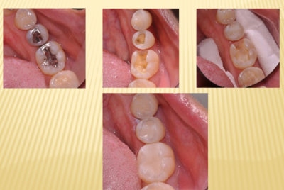 虫歯治療の修復には、今はほどんどが歯の色に近いものを使います。昔は、アマルガムといって水銀が入った合金をよく使っていましたが、今は使われなくなりました。水銀が入っているので恐ろしいもののように言われますが、合金になっていますので、ほとんど水銀単体のような為害作用はないと言われていますが、世界的に見ても使っている国はないようです。金銀パラジウム合金(金パラ)もよく使われていますが、名前を聞くと金が最初についているので、金が多く入っている金合金のように思われますが、実際のところ金は、12%しか入っておらず、パラジウムと銅が20%くらいずつ、あとはかさを増すために銀が50%くらい入っています。一時期世界的な金属の価格変動により、パラジウムが異常に高騰したため、金パラの価格も高騰し、保険治療で使うとそれだけで赤字になってしまうようになりました。金属を口の中に入れるということは、一日中金属のスプーンを舐めているようなもので、金属のアレルギーも考えられますし、金属のイオン化、酸化いわゆる錆、食べ物の温度差による延び縮みによる2次カリエス、セメントの流出もあり、あまり修復物には適した材料ではありません。(図1)ドイツやスウェーデンではパラジウムを歯科治療に用いることを禁止しています。