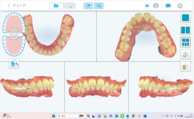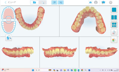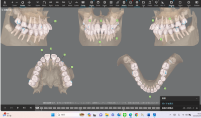 そこで、下顎を前に出した状態でクリンチェック(治療計画)を作ります。現在の咬み合わせの状態から歯を動かすのではなく、こういう咬み合わせになって欲しい状態で歯を動かしていきます。奥のすれ違いになった歯を改善したり、真ん中の奥歯を上げて咬み合わせを作り、上下に波打った下顎の咬み合わせの平面を平らにしたり、上顎前歯の角度を変えたりして歯並びを整えていきます。