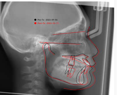 横から撮影した頭部の規格写真(セファロといいます)で通常の咬み方のセファロと下顎を前に出したセファロを重ねてみても、プロファイルは変わりなくイーラインの中に入っています。この患者さんは、下顎が奥に下がっているタイプの出っ歯ということになります。