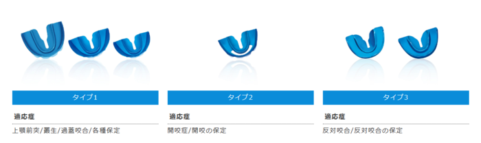 小児矯正で、当院で使用している装置は、プレオルソといいます。プレオルソは、以下のように症例によって次の3種類のタイプがあります。
