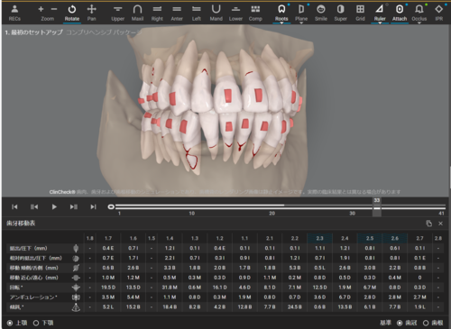 昨年8月から、インビザラインの治療計画のクリンチェックはCBCTの画像と連携するようになりました。これまでは、歯茎から見える範囲での歯の移動を見て計画を立てていましたが、CTと連携したクリンチェックでは顎の骨の中の歯根の動きも見ることができるようになりました。同じ患者さんのクリンチェックを見ていただきます。顎の骨が見えない状態ですと歯根が見えないのですが、CTと連携したものでは、歯根まで見ることができ、赤くマークしてある部分は、顎の骨から歯根が出ている部分を示しています。歯は顎の骨の中を移動しますので、この赤いマークが出ないように移動の仕方を考えます。骨は外側の固い皮質骨とその中のスポンジ様の海綿骨からできていますが、歯はこの海綿骨を移動していきますが、動く途中で歯根が皮質骨に当たってしまうと動かなくなってきます。クリンチェックでは、歯根が皮質骨に当たっていても移動する画像ができてくるので、歯肉と歯しか見えないクリンチェックでは、画像では動いているのに、実際は動かないことがありますし、マウスピースはポリウレタンというプラスティックでできているので、思わぬ動きが出てくることもあります。このようなメリットはほんの一部ですが、インビザラインは大きく進化したと感じます。
