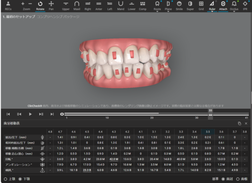 また、今年7月に、デンツプライ・シロナ社の口腔内スキャナーを導入しました。このスキャナーでも、マウスピース矯正のスキャンをすることができます。デンツプライ・シロナ社は、シュアスマイルという商品名のマウスピース矯正を販売しています。アタッチメントを付けたり、IPRを行ったりするのはインビザラインと変わりはありませんが、マウスピースのトリムラインを変えることができます。インビザラインではスキャロップ形態、写真では上のように歯の形に合わせているのに対し、シュアスマイルでは、スキャロップタイプもできますが、歯肉を1~2㎜覆ったストレートタイプを選択できます。(写真下の画像)歯を完全に覆うことができるので、しっかりと歯全体をつかむことができ、アタッチメントを少なくすることができます。またシュアスマイルもCTと連動していますので、顎の骨の中を移動させることができます。マウスピース矯正は、いろいろな種類が出ています。それぞれ特徴があります。みと歯科・矯正歯科では、その中でもこれまでの治療症例の多い歴史のあるものを選び、採用しています。