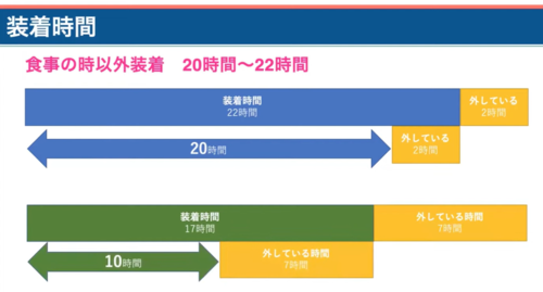 まず一つ目は、使用時間です。アライナー矯正は、アライナーで動かしていくものなので、使用しないと動きません。また、アライナーはご自分で取り外しができるので、ついうっかりと忘れてしまうことがあります。当院では、食事とブラッシングなどの口腔衛生に割く時間以外、できれば22時間の使用を勧めています。22時間装着すると2時間つけない状態になりますが、この2時間は止まった状態になるのではなく、後戻りすると考えていただきたいのです。22時間つけていても実質20時間の効果になるのです。もし17時間装着したとすると7時間つけていないので、7時間後戻りをすると考えると、10時間の効果しか出ていないことになります。食後は、できれば歯ブラシをして、口の中を清潔にしてから装着するのが一番ですが、それにこだわっていると装着時間が少なくなってしまします。家族やお友達と外食やお茶をしたり、子供でも給を食べ、友達と駄菓子屋に行くこともあるでしょう。歯磨きしないと装着できないとこだわっていると装着する時間が少なくなってしまいがちです。すぐに歯磨きできないときは、お水かお茶で口をゆすいで、それから装着するようにすると結構長い時間つけられるものです。少なくとも20時間は装着していただきたいのですが、18時間しか装着できない日があれば、次の日に21時間、またその次の日も21時間頑張って装着して平均20時間を守ってほしいと思います。また、常温以下の飲み物でしたら、装着したままでも構いませんが、砂糖、炭水化物、炭酸の入ったものは虫歯の原因になるので避けてください。