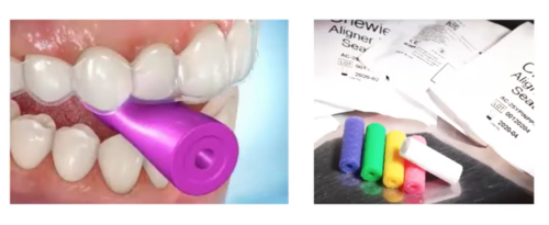 二つ目は、アライナーチューイをしっかりと使用することです。アライナーチューイはシリコンでできた弾力性のある円筒状の装置です。アライナーは使用時間が大切とお話ししましたが、しっかりと入っていることが大変重要になります。アライナーチューイは、アライナーを歯にフィットさせるもので、適切な圧力をアライナーにかけることができて、歯の移動をスムーズにさせます。特に難しい動きのところは念入りに咬んでアライナーをフィットさせます。アライナーチューイを咬むと口の周りの血流が20%も改善され、歯が早く動くという報告もあります。